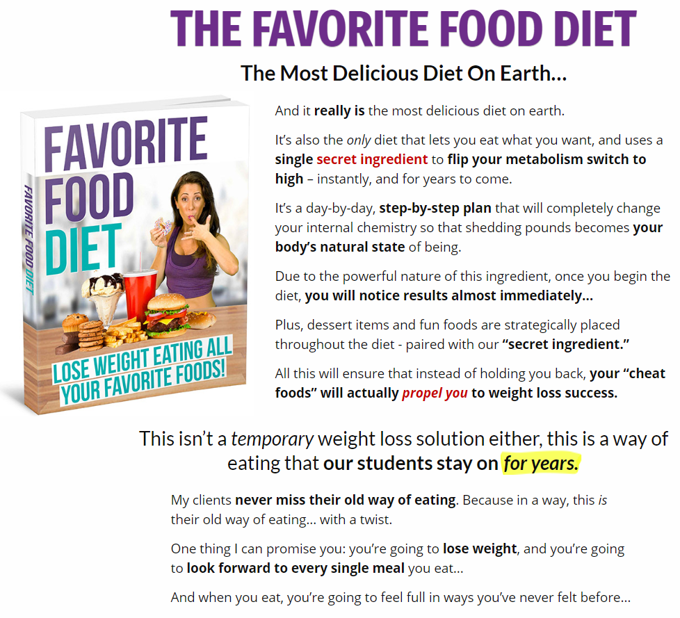 An online weight loss regime that shows you the way to eat the foods you love and still lose weight. Imagine that! Impossible, right? Well, that’s exactly what the weight loss industry has tricked you into believing because it makes a killing on people trying to lose weight. So of course, they make it difficult to do so (ahem, prohibiting delicious foods) which keeps people just like you and I coming back for more. But the proof is in the pudding – pardon the pun; you can eat the foods you love and still achieve your weight loss goals and that’s what The Favorite Food Diet is here to teach you.