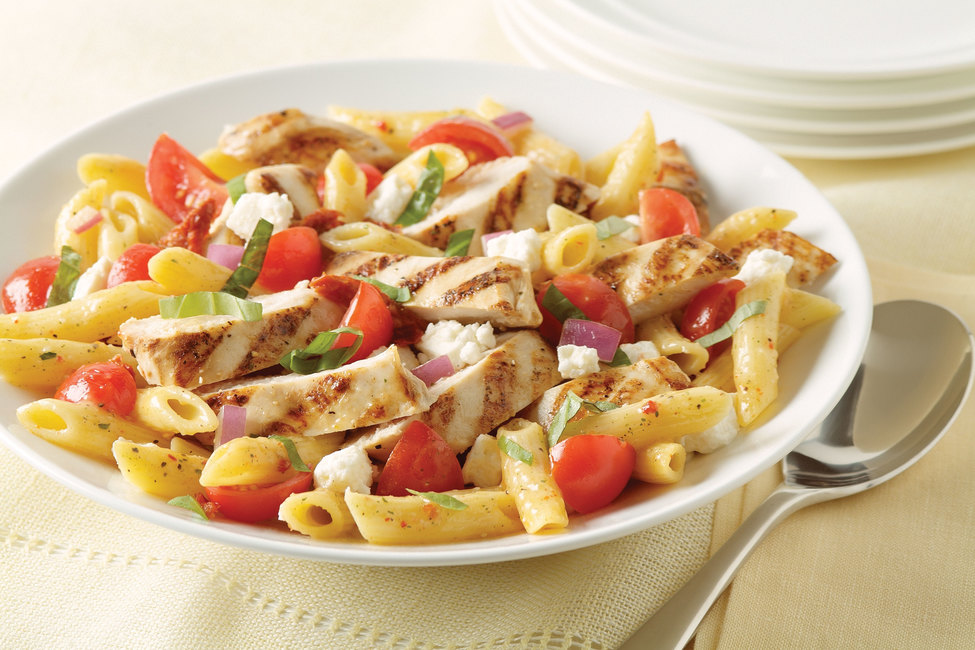 Strip-cut 1 grilled chicken breast, toss 1/2 cup cooked whole wheat pasta with 1 cup sauteed spinach and 2 tablespoons each pine nuts and low-fat feta. Sprinkle with capers and chopped tomatoes. 378 calories