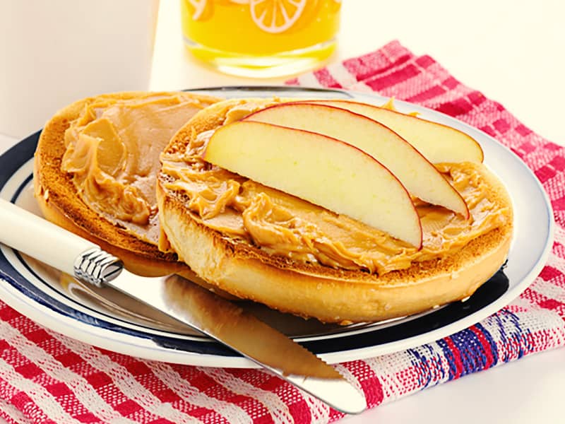 Toast a whole-grain bagel and spread with 1 tablespoon reduced-fat all-natural peanut butter. Cover with slices from 1 apple. 335 calories