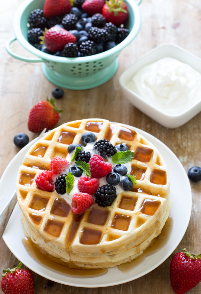 Top 2 whole-grain waffles with 1/4 cup low-fat plain yogurt, 1/2 cup mixed berries, and 2 teaspoons maple syrup. 246 calories