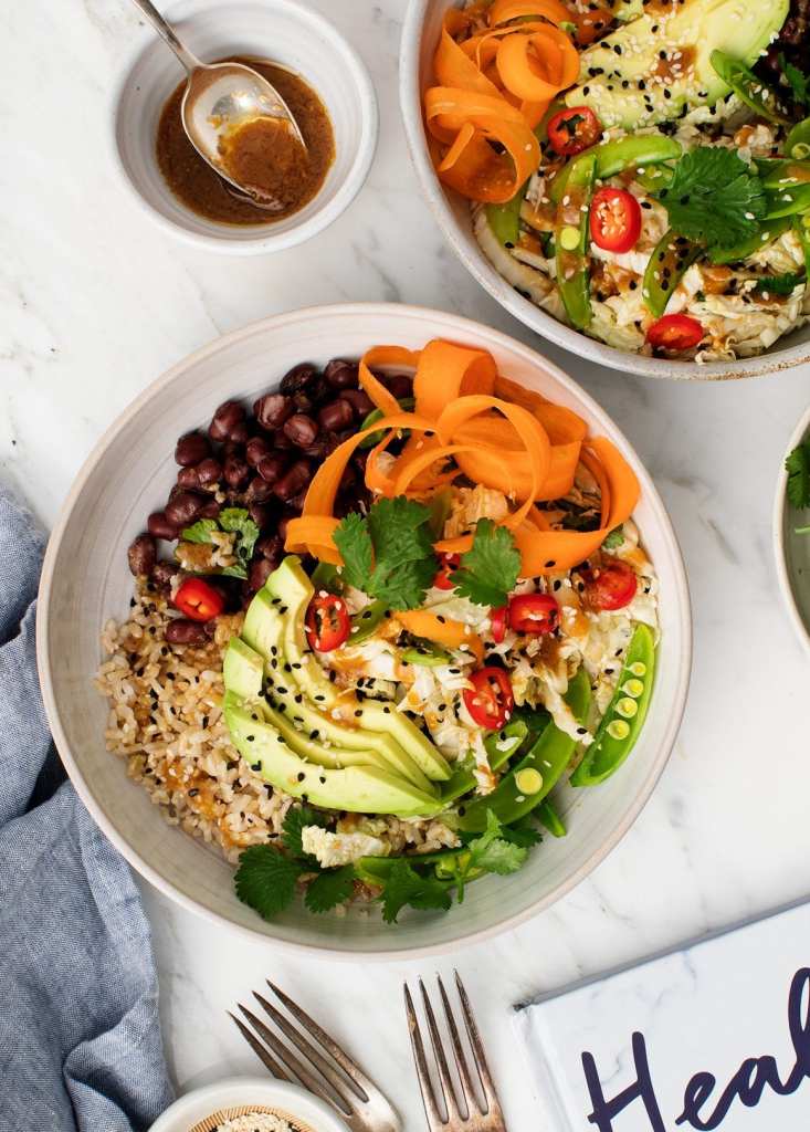 Cook 1/2 cup each black beans, chopped bell pepper, and chopped onion and 1 chopped jalapeno in a pan with 2 teaspoons olive oil for 5 minutes. Place over cooked brown rice; top with 1/4 avocado, sliced. 305 calories