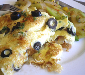 - Cut the baked eggs into six 5-inch squares. Using a spatula, lift each square from the pan and invert onto a plate. Divide warm vegetable mixture among omelets; top with cheese. Fold omelets diagonally in half, forming triangles. If desired, drizzle with additional tomato sauce.