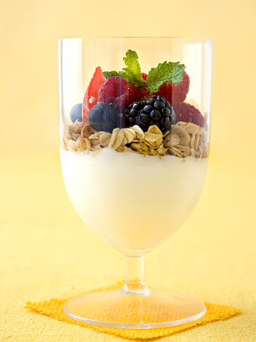 Top 1/2 cup low-fat Greek yogurt with 1/4 cup low-fat granola, 1 teaspoon slivered almonds & oatmeal, 1 tablespoon honey, and 1/2 cup berries. 303 calories