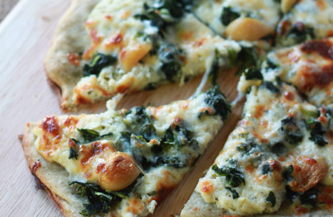 Spread 1/3 cup tomato sauce on 1 naan. Top with 2 cups spinach, 1/4 cup low-fat mozzarella cheese, and 1 tablespoon slivered almonds. Bake at 350 degrees F. until melted. 366 calories